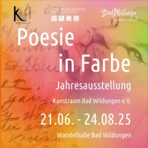 Die Jahresausstellung des Kunstraum Bad Wildungen e.V., mit dem Titel „Poesie in Farbe“, findet vom 21. Juni bis zum 24. August 2025 statt. Die Ausstellung ist täglich von 10 bis 17 Uhr in der Wandelhalle Bad Wildungen, Foyer 2. OG, geöffnet und der Eintritt ist frei, laut einem Flyer der Ausstellung. Für einen Workshop kann man sich unter der Telefonnummer 05621 / 96 796 11 oder per E-Mail anmelden